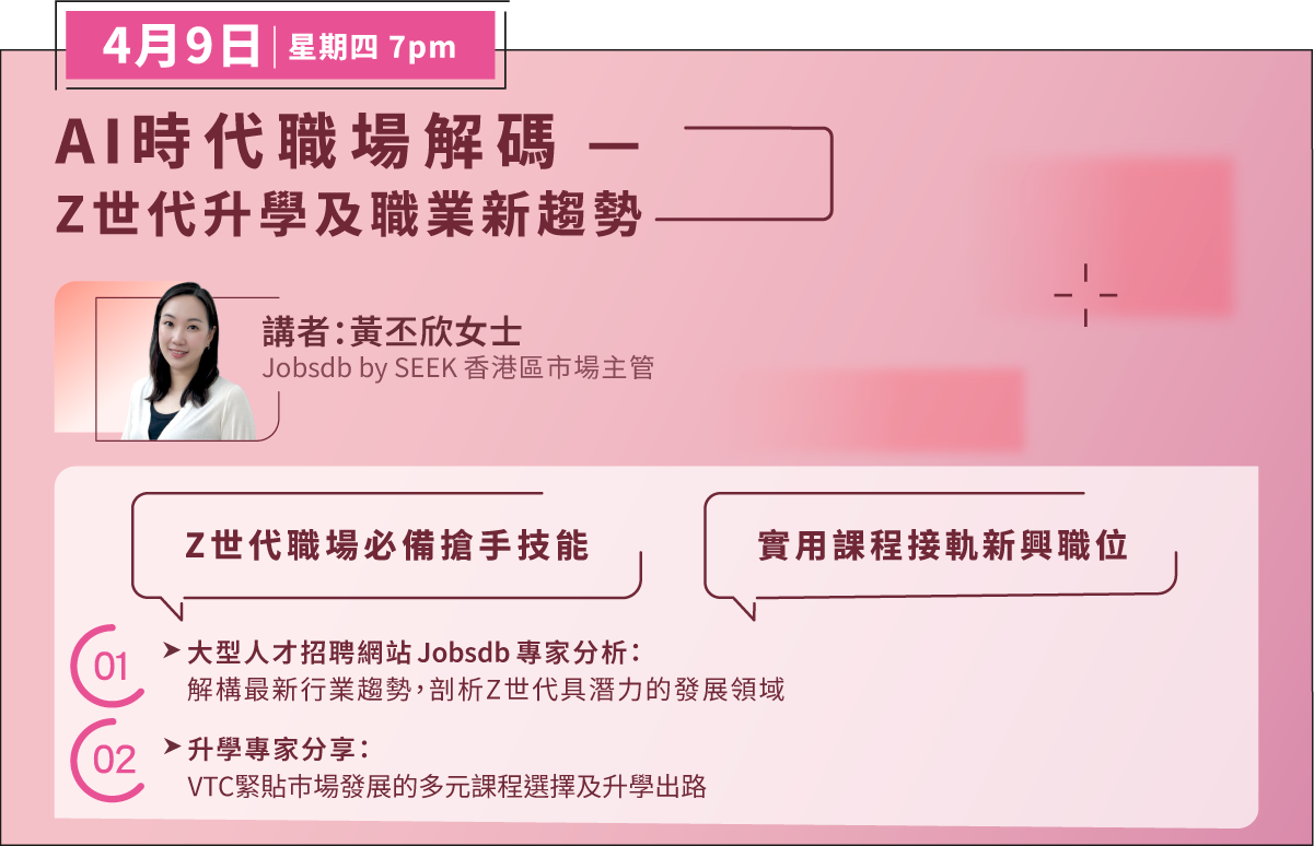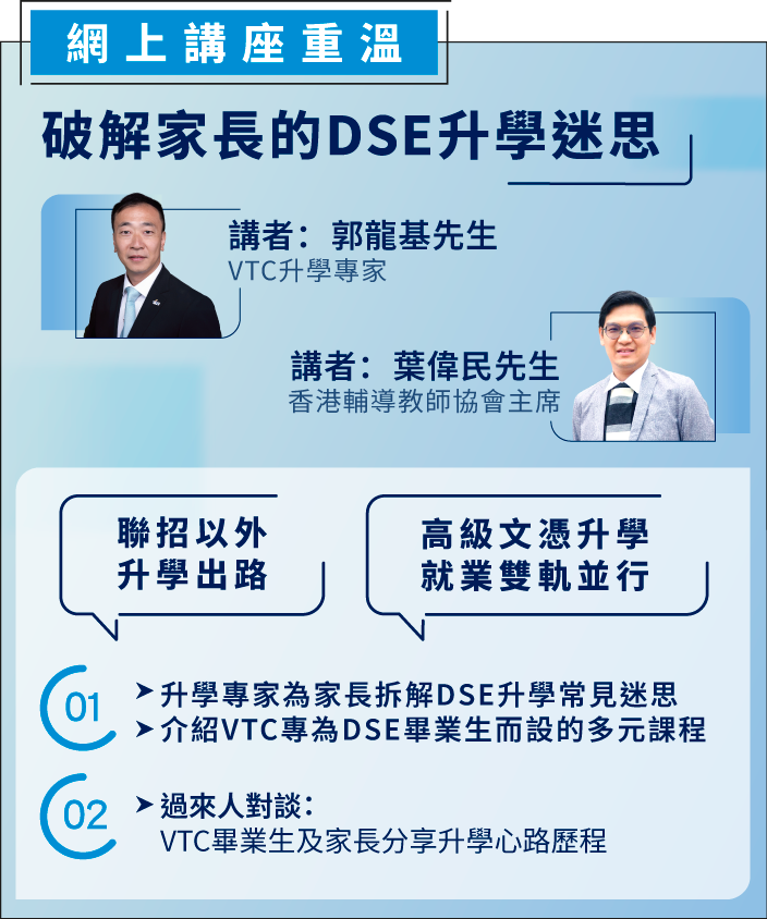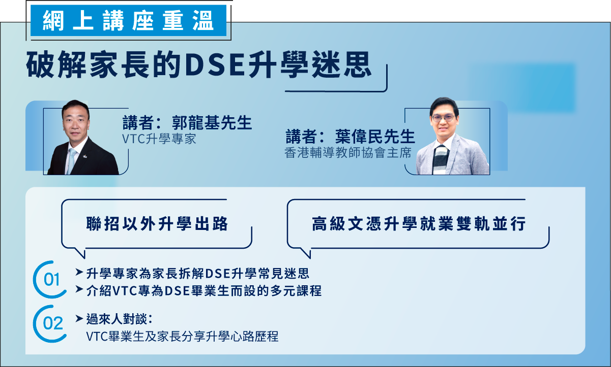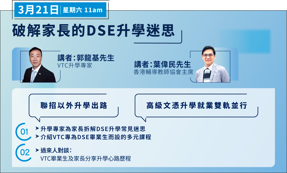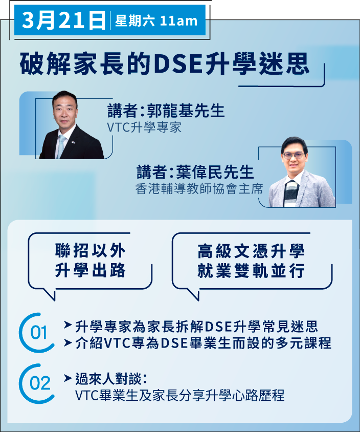 VTC將於稍後透過短訊/電郵向參加者發放網上直播連結。 © 2026 職業訓練局。版權所有。 VTC保留更改及取消講座及活動的權利而無須另行通知。 This website carries information of the Parents Programme 2026 which will be conducted in Cantonese. For enquiries, please reach us at 2836-1888.